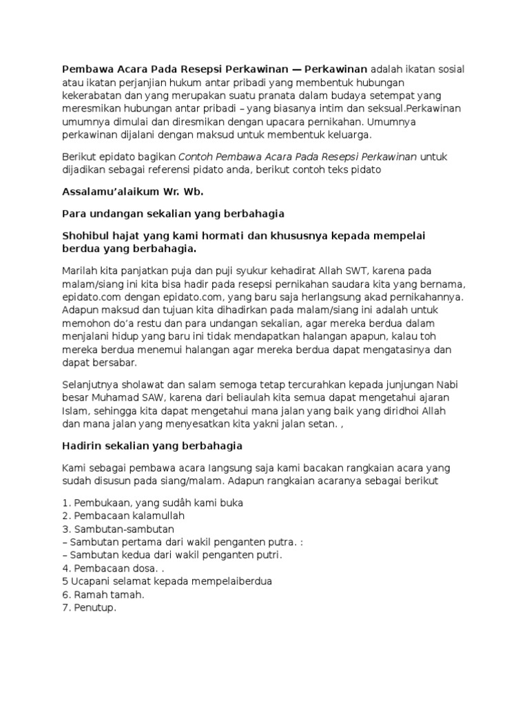 Panduan Pelaku Utama Upacara Resepsi Pernikahan Adat Jawa Kumpulan Contoh Sambutan Pembawa Acara Narasi Menebus Kembar Mayang Dan Gending Institutional Repository Isi Surakarta from data03.123dok.com Momen pernikahan harus diselenggarakan berdasarkan rancangan acara yang tepat. Sambutan ketua pelaksana civil cup politeknik negeri malang 2014.kepada saudari fathia datumarin kami persilahkan. Cari tau contoh susunan acaranya di artikel berikut ini. Contoh naskah pembawa acara lamaran pernikahan. Contoh kata sambutan acara pelantikan contoh kata sambutan pembukaan acara Ditulis oleh ( +rinal purba ). Menyusun acara akad dan resepsi sama pentingnya dengan mempertimbangkan budget pernikahan. Beberapa saat setelah acara makan selesai, kamu bisa menutup acara.