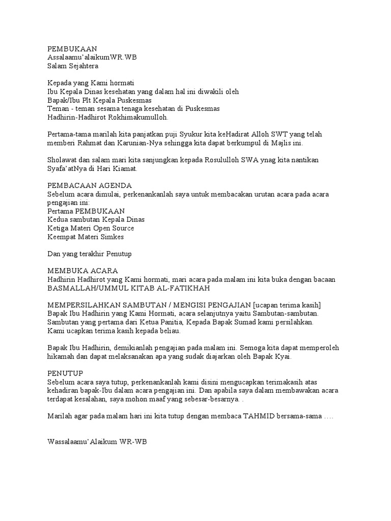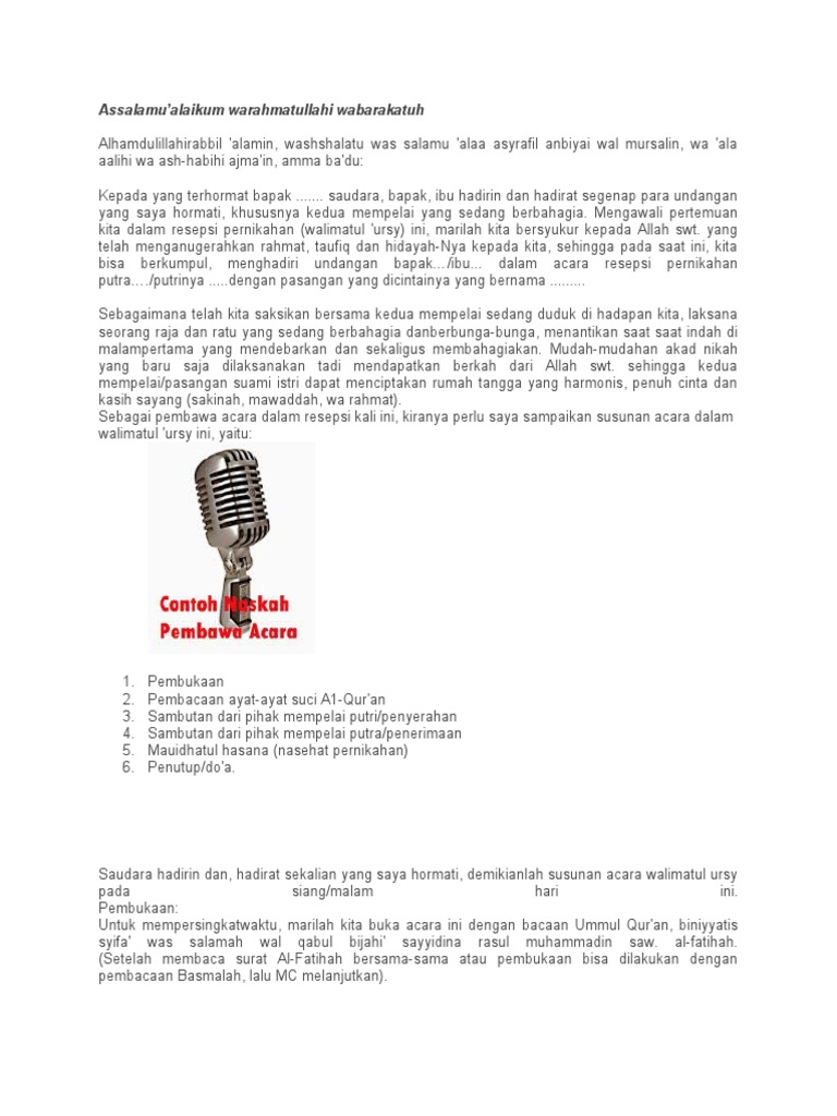 Tentunya tujuan utama ketika menggunakan sebuah pantun untuk pembuka salam ini yaitu agar semakin menarik audiens. Oleh karena itu kita sebagai umat muslim kita harus membaca doa pembuka dan doa ini dapat memperlancar sebuah acara dari dimulainya acara hingga berakhirnya acara. Pada umumnya, acara ini dilangsungkan 3 jam sebelum resepsi. Contoh naskah pembawa acara lamaran pernikahan. Info sambutan penutupan panitia pernikahan terbaru pada website undangan.me ini, kami sangat membutuhkan sekali kontribusi dari semua pembaca artikel terkait sambutan penutupan.